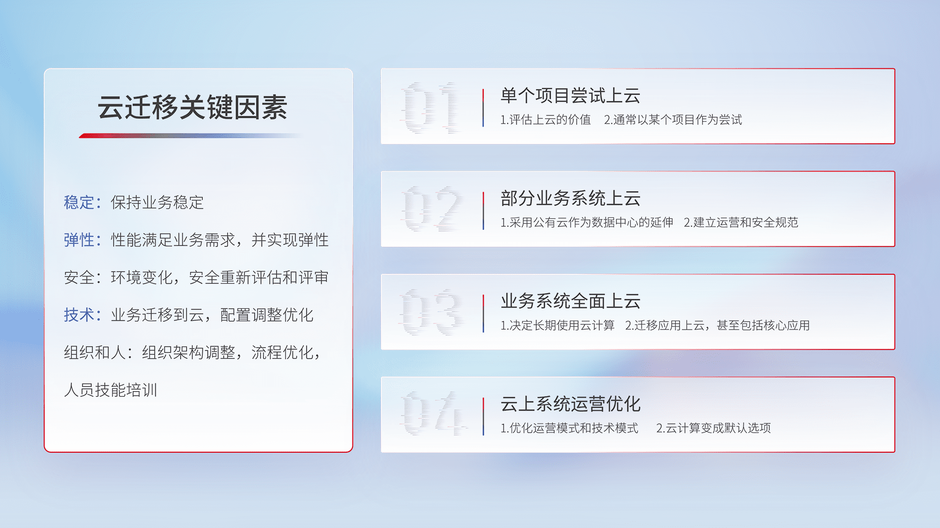 结合实际业务,,从规划设计、、云平台选型、、云原生改造、、、、数据迁移、、、、集成交付,,,迁移全过程为客户识别最佳上云路径,,,做好风险识别管理,,,,设计网络架构、、、身份权限、、安全审计合规、、、、操作审计、、、日志审计、、、、监控告警策略、、、多站点容灾设计等,,对云上基础设施进行整体规划,,,提升IT治理水平,,以满足弹性、、高可用、、、、高性能的需求。。。。