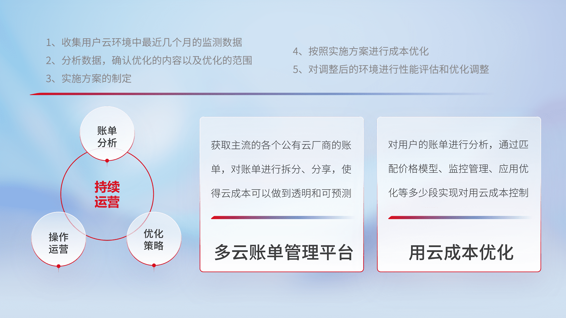 通过多云纳管,,以统一的资源数据模型把客户的云资源进行抽象和封装,,进而实现对多云资源的统一操作,,,,保障云资源管理的可靠性、、稳定性与可用性。。量身定制化运维内容,,,,配置、、开发运维、、、补丁管理、、、备份、、、监控、、、认证和访问管理、、、、审计和日常巡检等,,,,保障在用云过程中的可靠度,,,稳定度以及高可用率。。。。